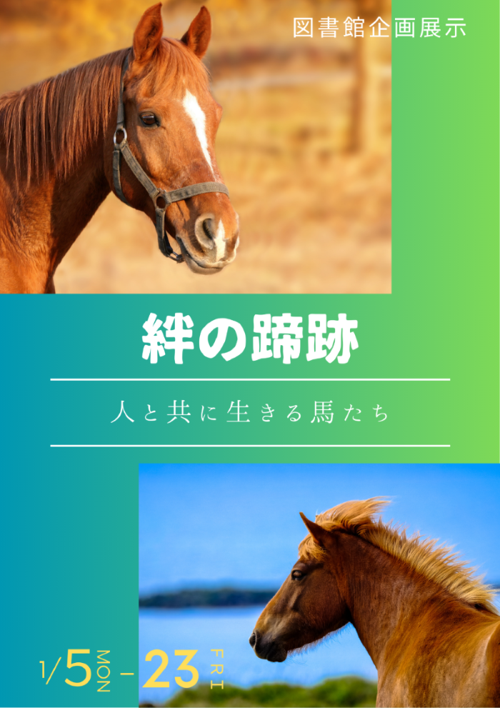 図書館企画展示「絆の蹄跡‐人と共に生きる馬たち」を開催しています(1/5~23)